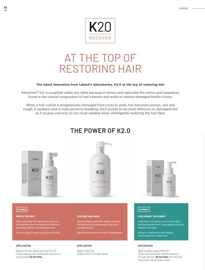 A deeply hydrating and repartive take home treatment that restores and protects hair between salon visits. Clients can achieve soft, shiny, manageable hair at home with the Lakmé k2.0 Recover Hyaluronic Treatment.